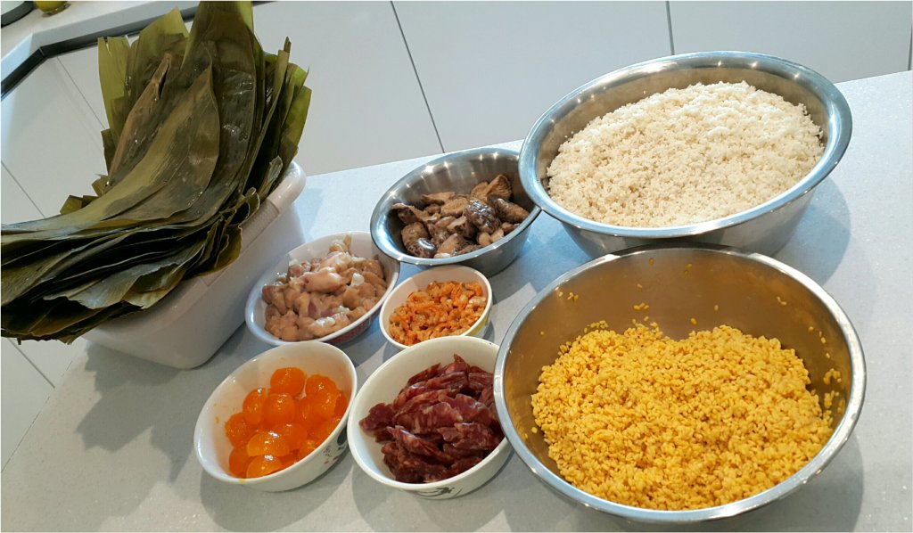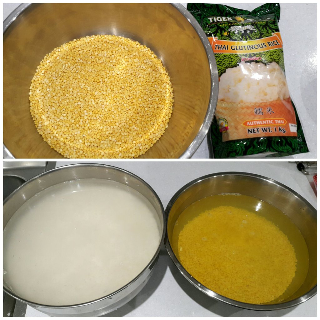 - 1kg糯米和500g 綠豆肉,水浸過面,浸一晚,糯米過篩後用五香粉,少許糖,少許鹽,少許雞粉醃一會