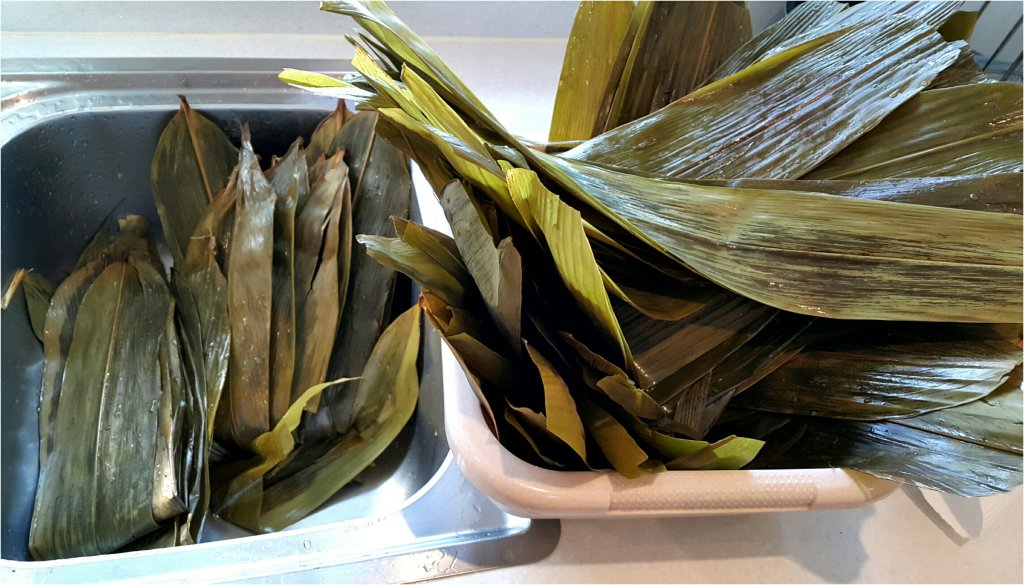 | 先將粽葉放入水盤浸1晚,再放入大湯煲,水浸過面,加入5湯匙生油,水滾後關火,放涼備用 |