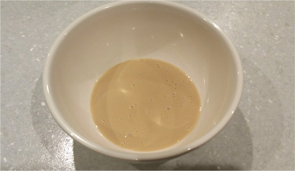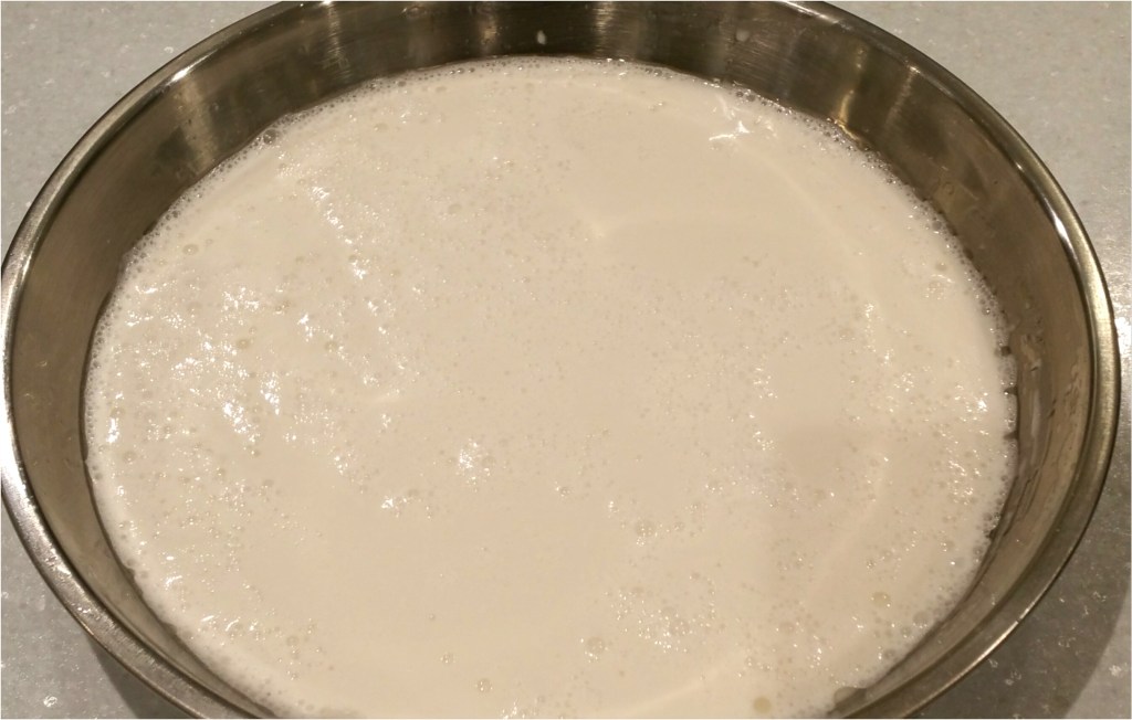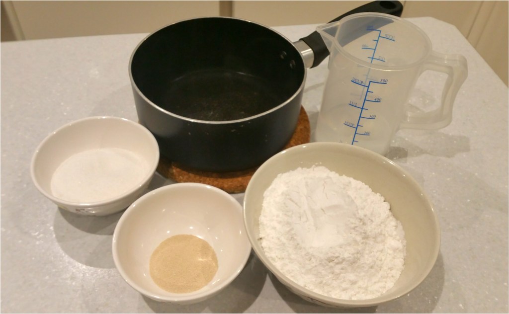 預備5克酵母粉加入1茶匙白糖,及2湯匙暖水拌勻,靜待10至15分鐘,等至滿氣泡備用