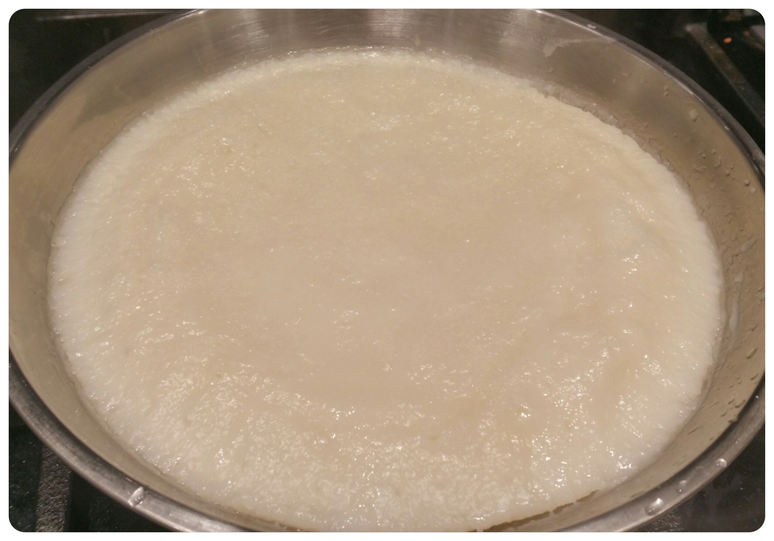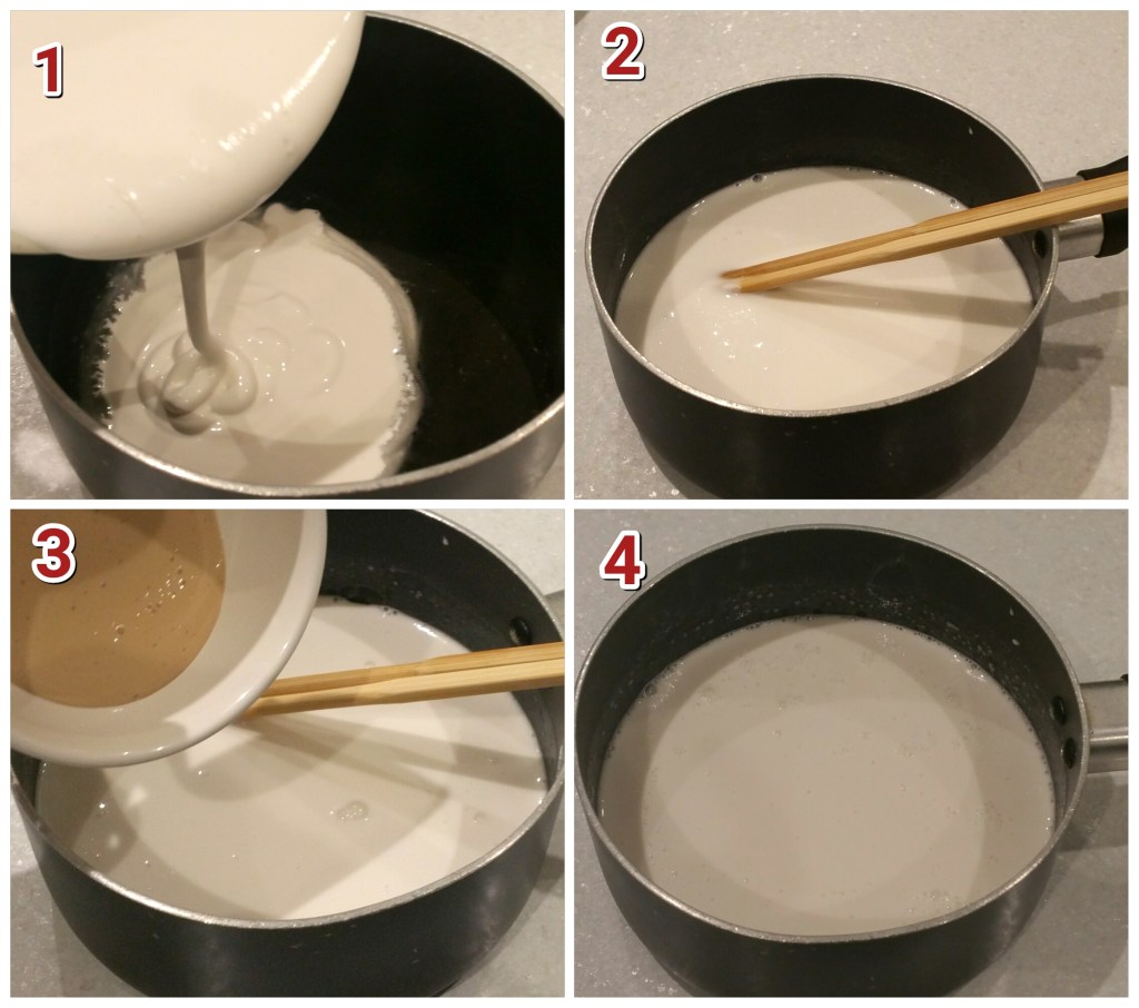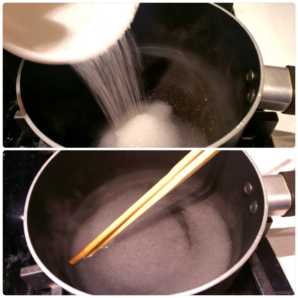 先將150克水加入細煲 , 煲滾後,轉細火加入白糖80克拌勻,白糖完全溶化後關火,放涼備用