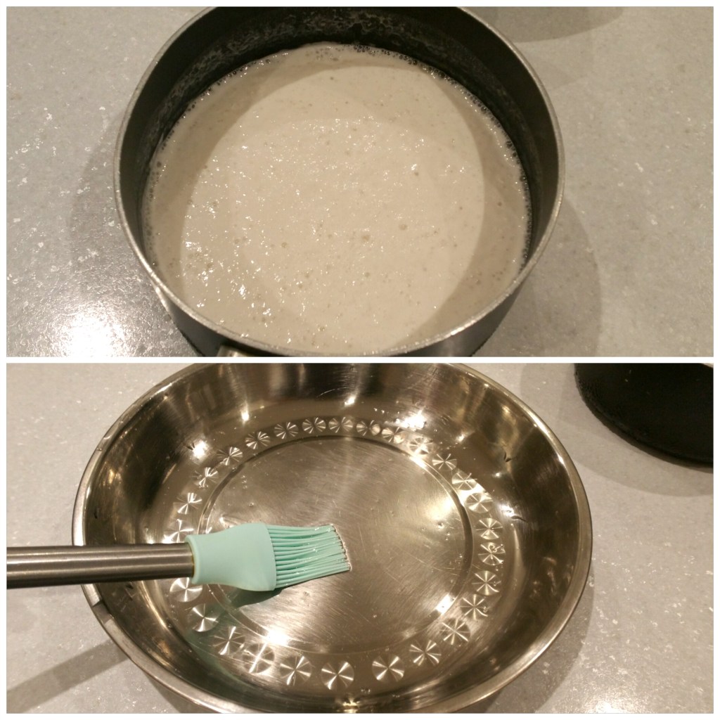 完成發酵後,略為攪拌,大碟塗上生油備用