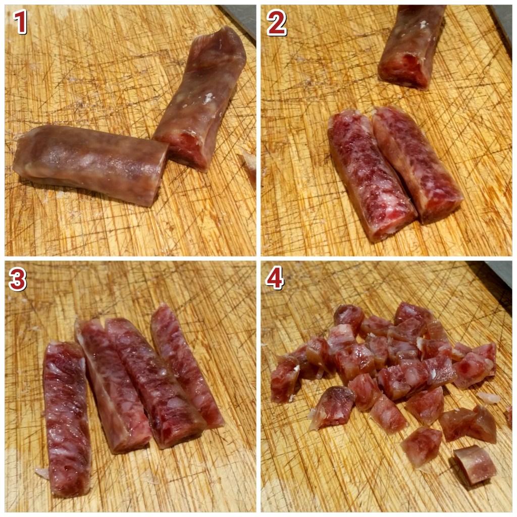 - 臘腸先頭和尾硬皮切走不要,中間切一半