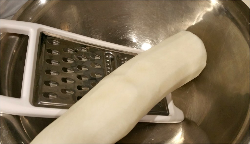 白蘿蔔先切去頭和尾不要,再刨去表皮,便可以開始刨絲,用最粗孔刨,刨到最後用刀切薄片就可以