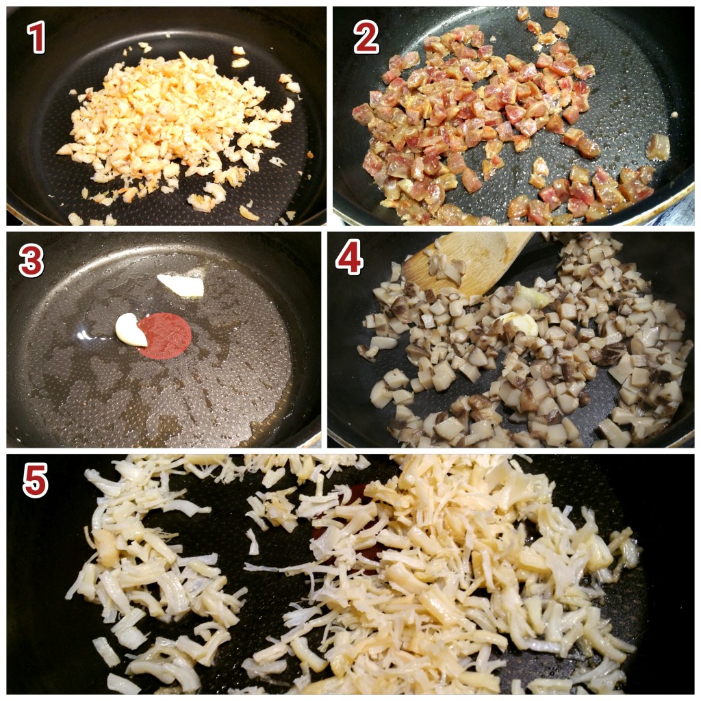 材料:蝦米先浸15至30分鐘水,軟身便可以切碎,臘腸先用滾水略浸幾分鐘,然後切粒,冬菇如果太厚,浸軟後,打橫中間切一刀,再切粒,乾瑤柱先浸一晚水,隔日用手指搓開成絲