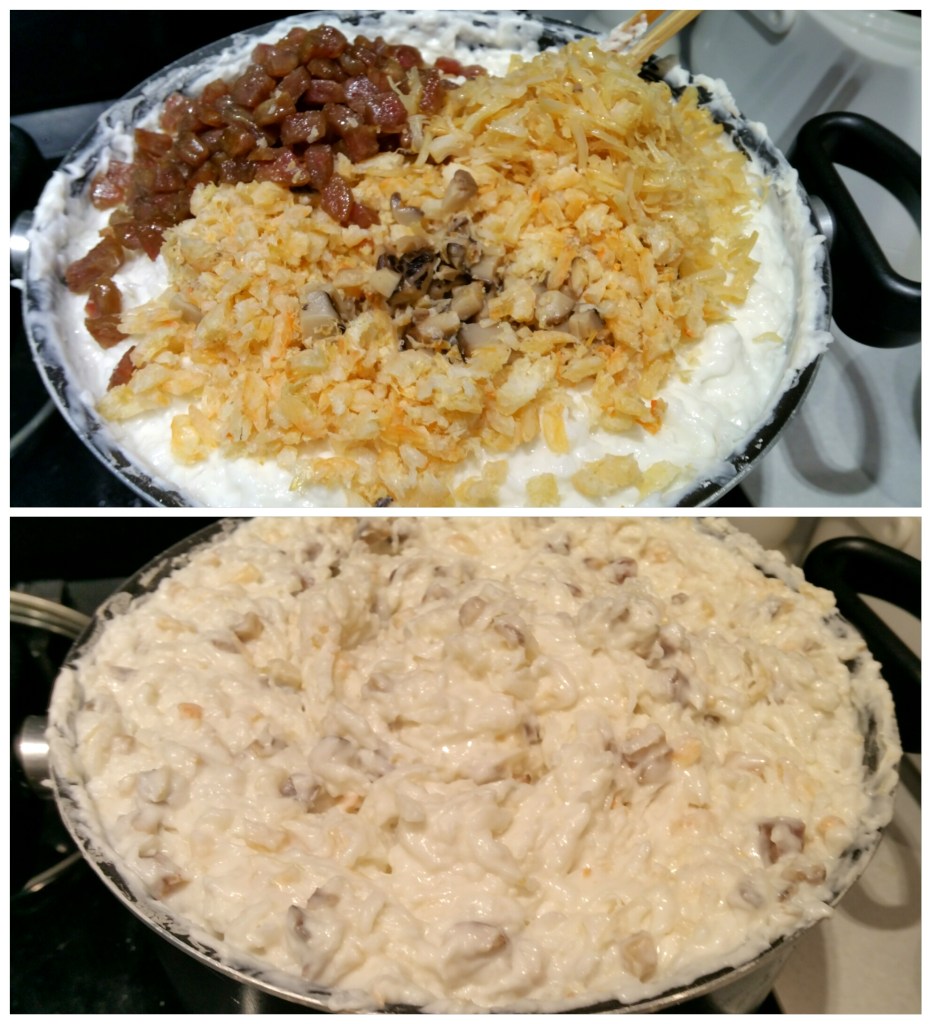 加入已炒香冬菇,蝦米,臘腸和乾瑤柱拌勻