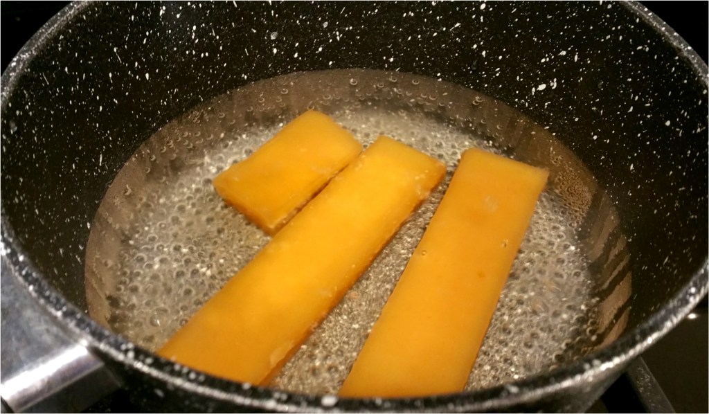 600克水加入細煲,大火滾後加入200克片糖,滾後轉細火至片糖完全溶解