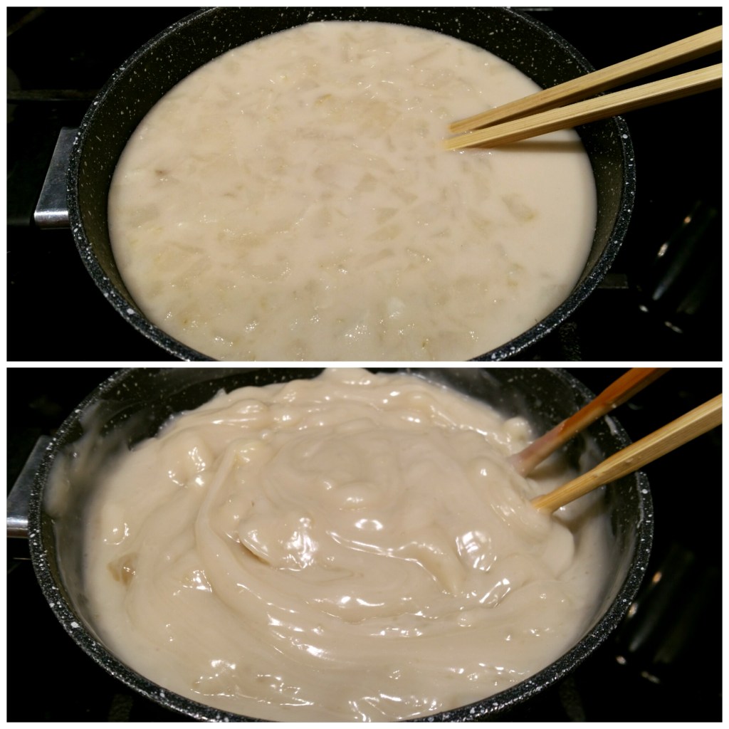 維持細火,用快子攪拌以免結塊,攪拌至滑糊狀便關火,完成