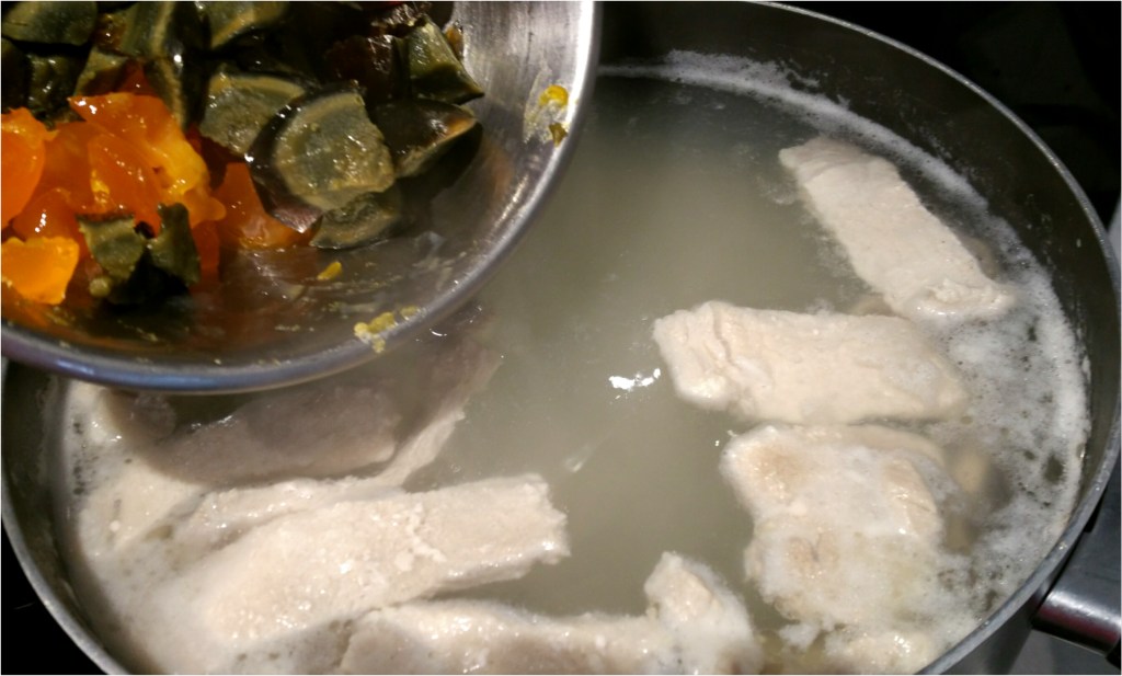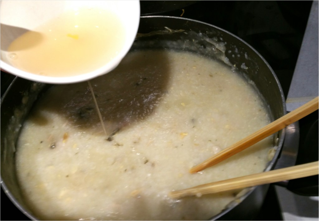 煲完後,保持中細火,加入咸蛋白,用快子快速拌勻