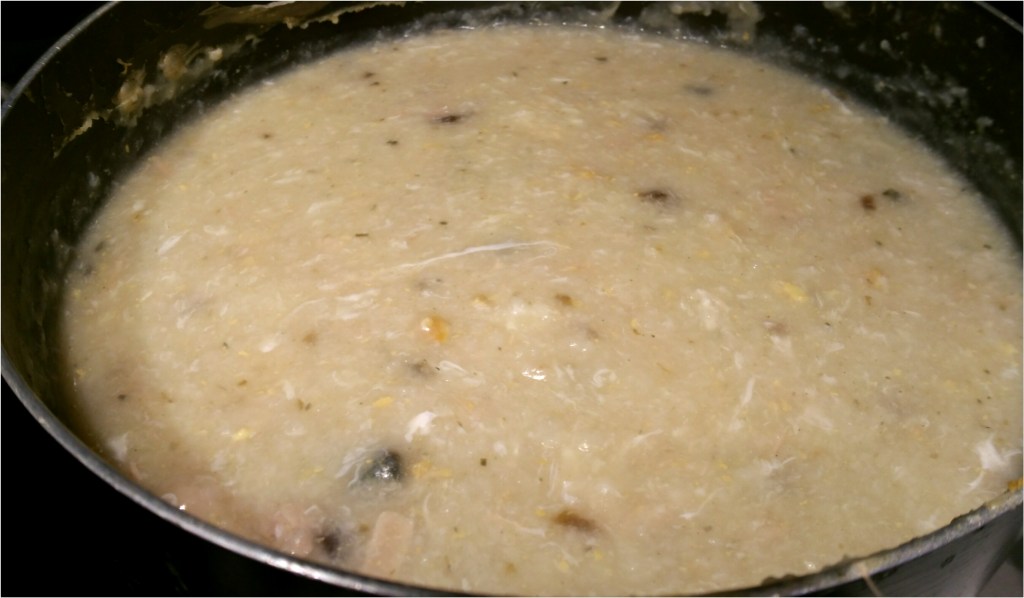 水滾後轉中細火,斜蓋著,起細泡,煲2.5小時或煲至自己滿意粥滑溜的程度(煲粥其間要間中拌勻,防止粥黏煲底