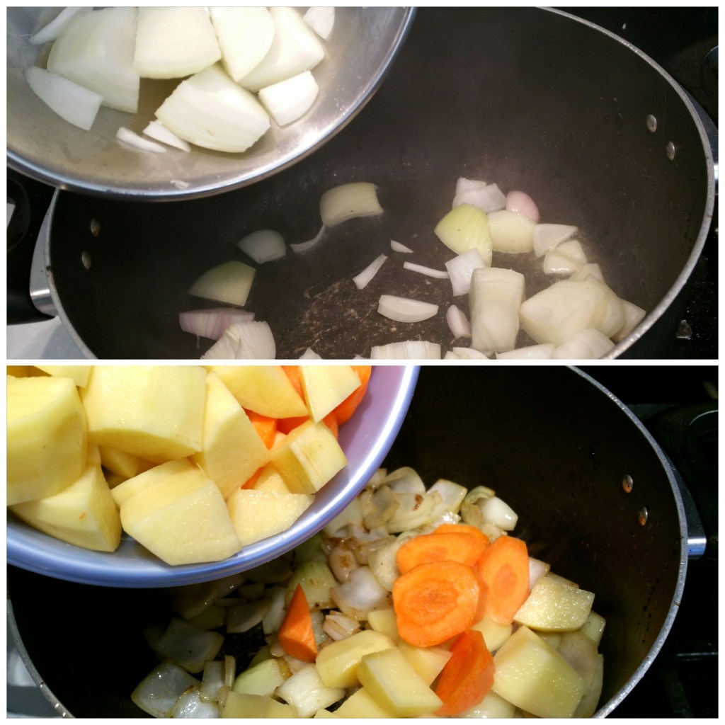中大火燒熱煲/鑊,加入兩湯匙油,再加入已切角洋蔥,加入少許糖炒至金黃色邊,之後加入薯仔和紅蘿蔔灑入少許鹽略炒一會