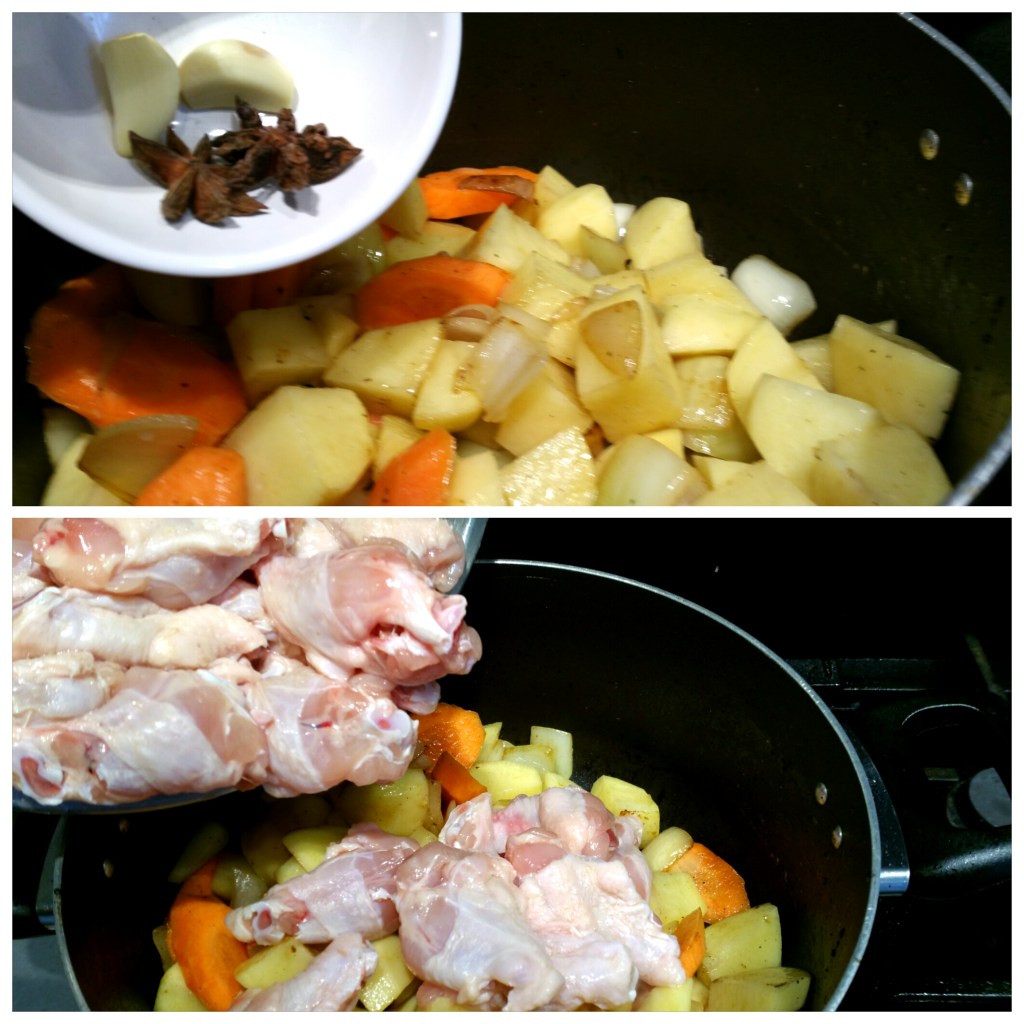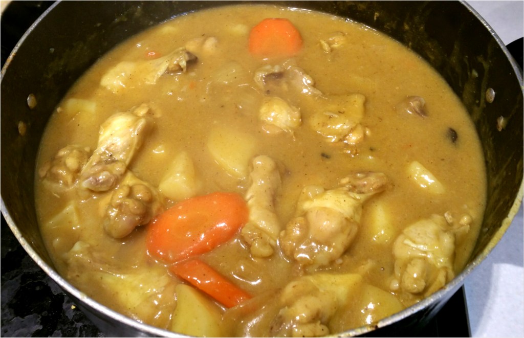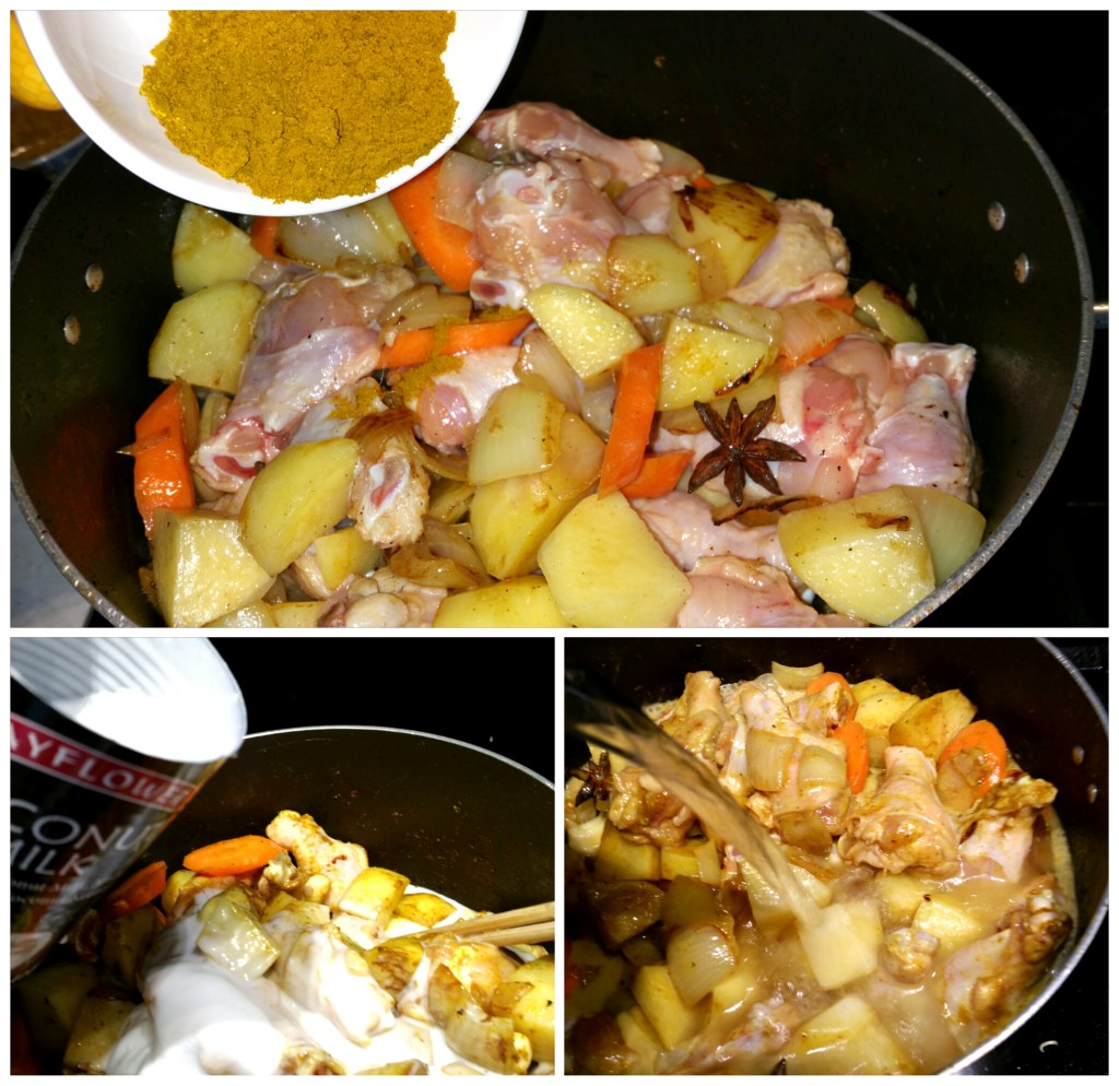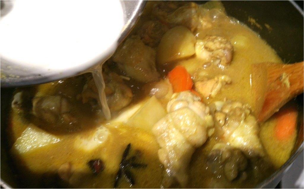 加入兩湯匙咖哩粉炒勻,再加入椰奶200克或半罐炒勻,然後加入熱水至餸面的底一吋(但咖哩汁一定要浸過薯仔和紅蘿蔔面,除了雞槌),再略為調味,加入雞粉2荼匙,鹽1荼匙,糖1荼匙,生抽1至2荼匙(咖哩調色作用),蓋住,汁滾後轉細火,炆至20分鐘,如果用快子輕易拮穿紅蘿蔔便完成