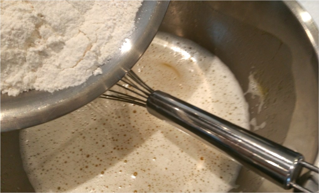 將已過篩粉類逐少加入蛋漿拌勻