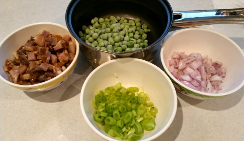材料,煲白米飯是平時煲飯的水低過半個手指頭(飯有少少硬身會容易炒),蛋液,蝦切細粒,青豆用滾水先煲熟備用,叉燒切細粒, 蔥花,紅蔥頭切碎
