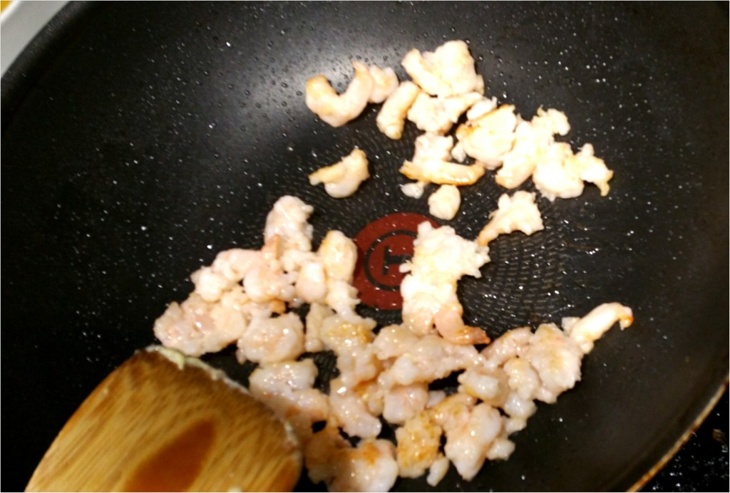 中大火燒熱鑊,加入一湯匙生油,加入蝦煎至底面兩邊金黃色(表示蝦已熟透),盛起備用