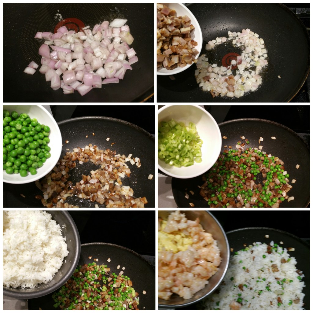 中大火燒熱鑊,加入2湯匙生油,加入紅蔥頭粒,略炒至有香味,再加入叉燒略炒,再加入已煲熟的青豆略炒,然後加入蔥花略炒,再加入白飯炒勻,最後加入已炒熟的蛋和蝦炒勻