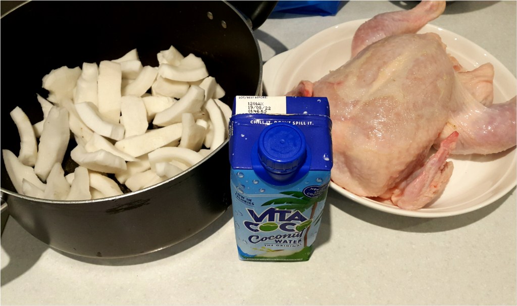 椰子3個,搗出椰水,用膠袋入好,隔住布用硬物仆爛,起椰肉,去皮備用。雞一隻汆水備用。1支500毫升椰水。